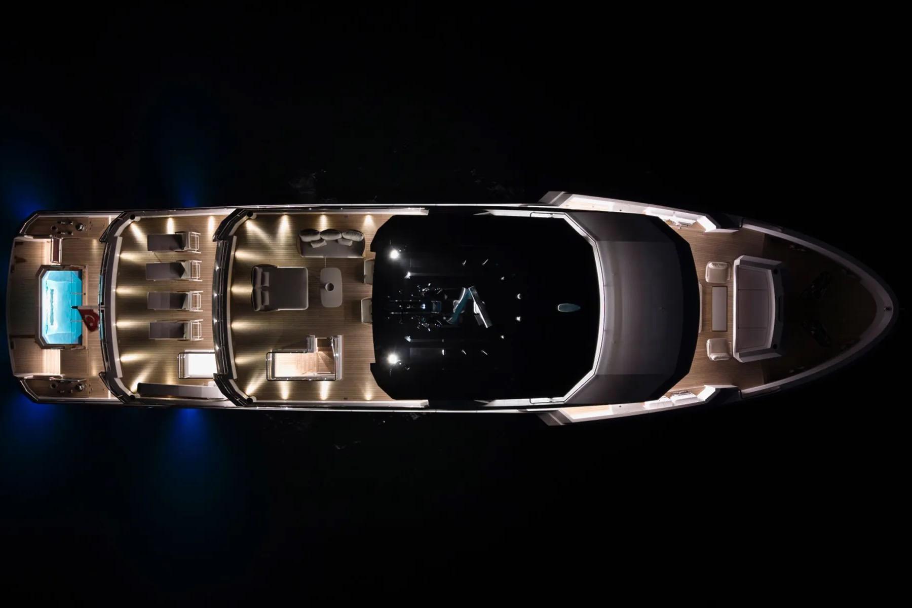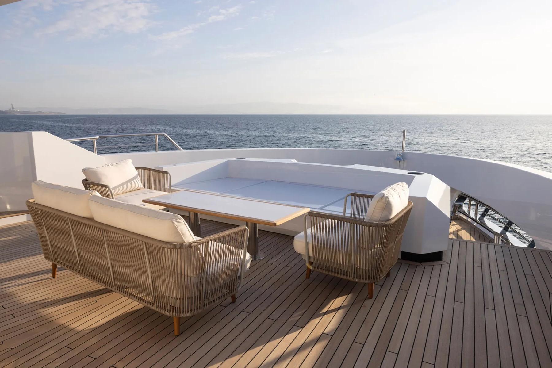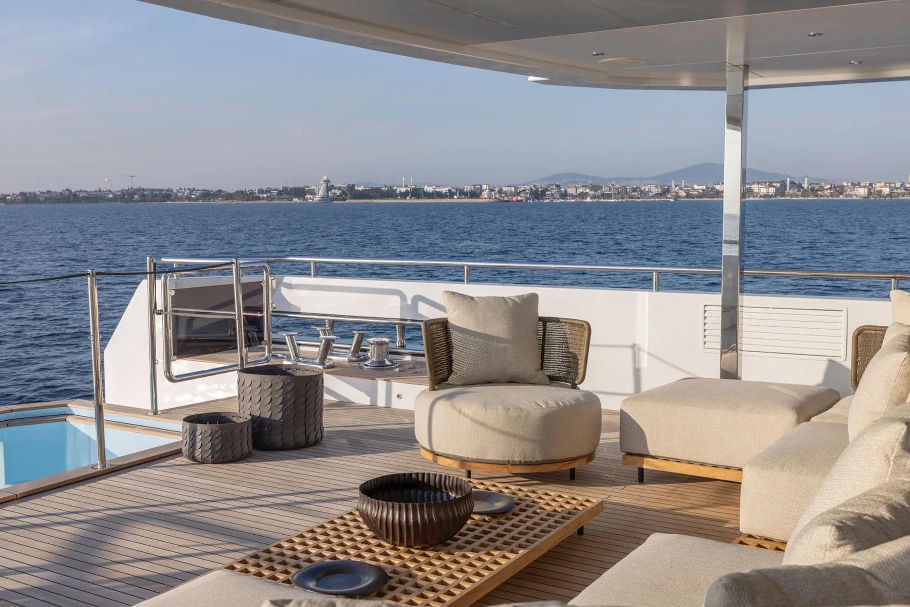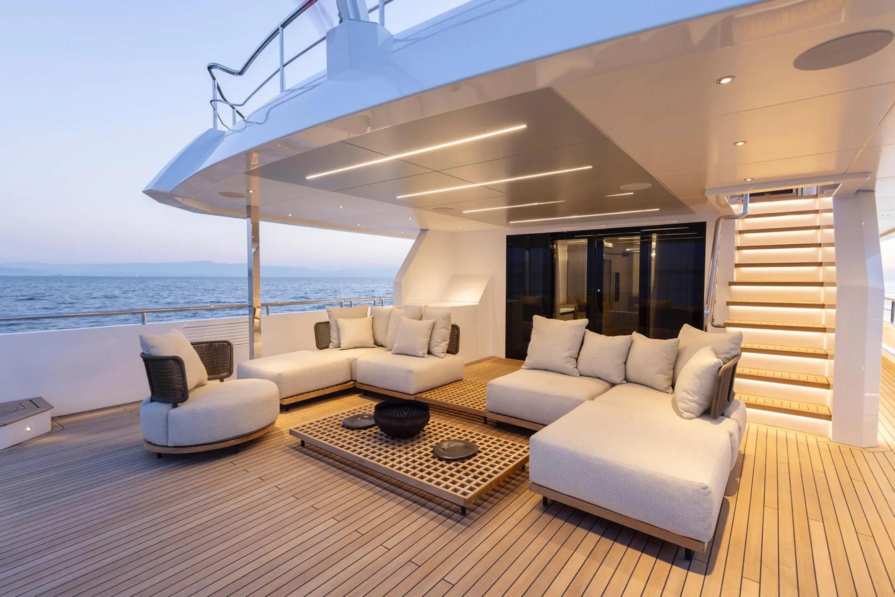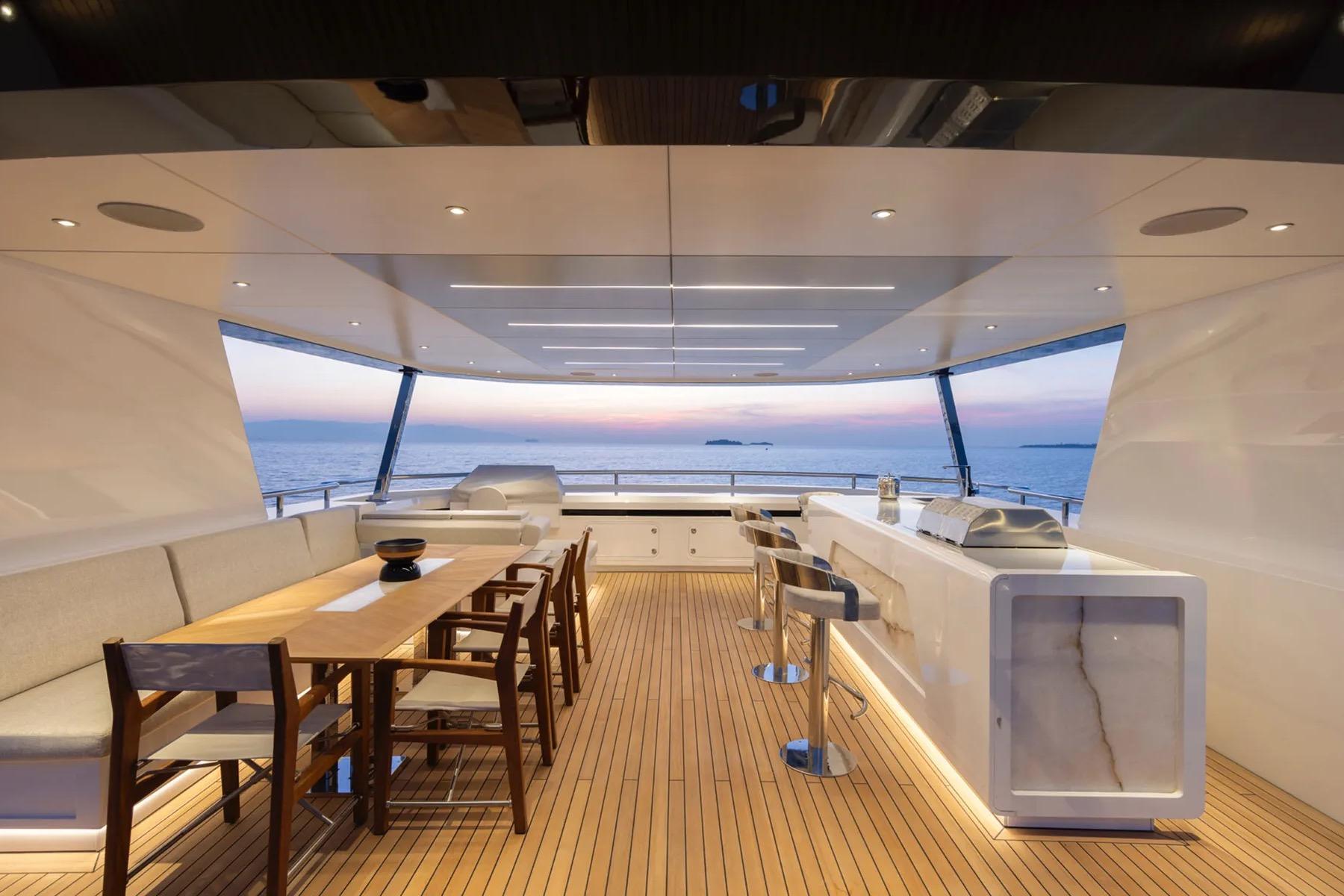 Elegant interior spaces are bathed in natural light through panoramic windows, finished in light oak, lacquered surfaces, and leather accents. Outdoors, she features a stunning aft-deck jacuzzi with infinity views, a spacious beach club with direct sea access, and a panoramic sundeck with bar and lounge area.