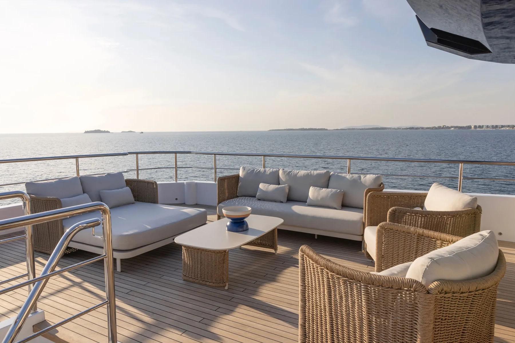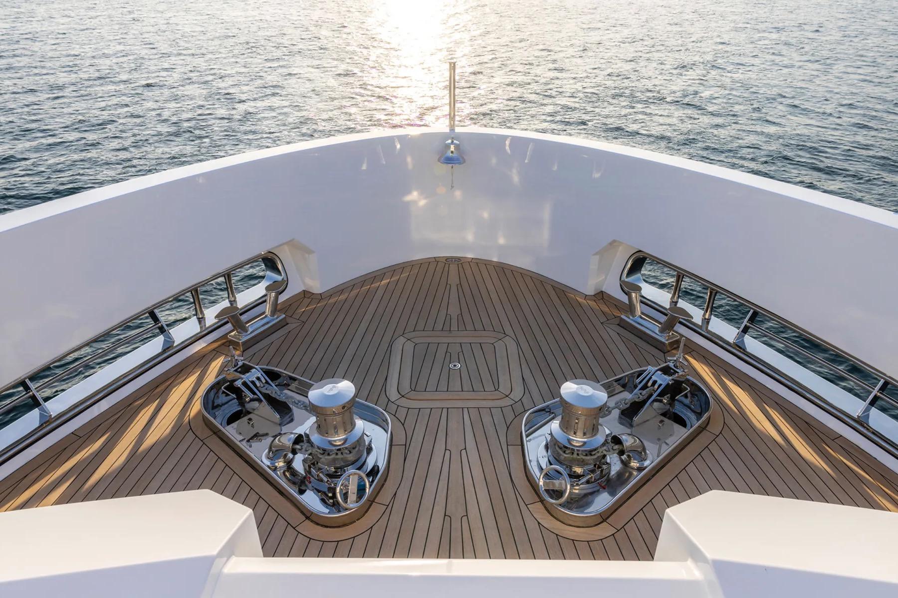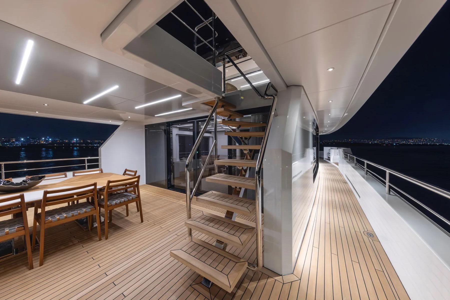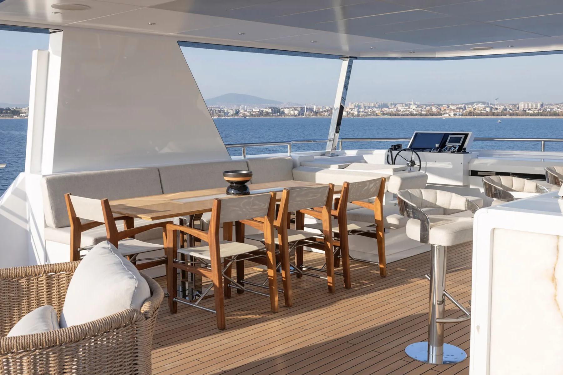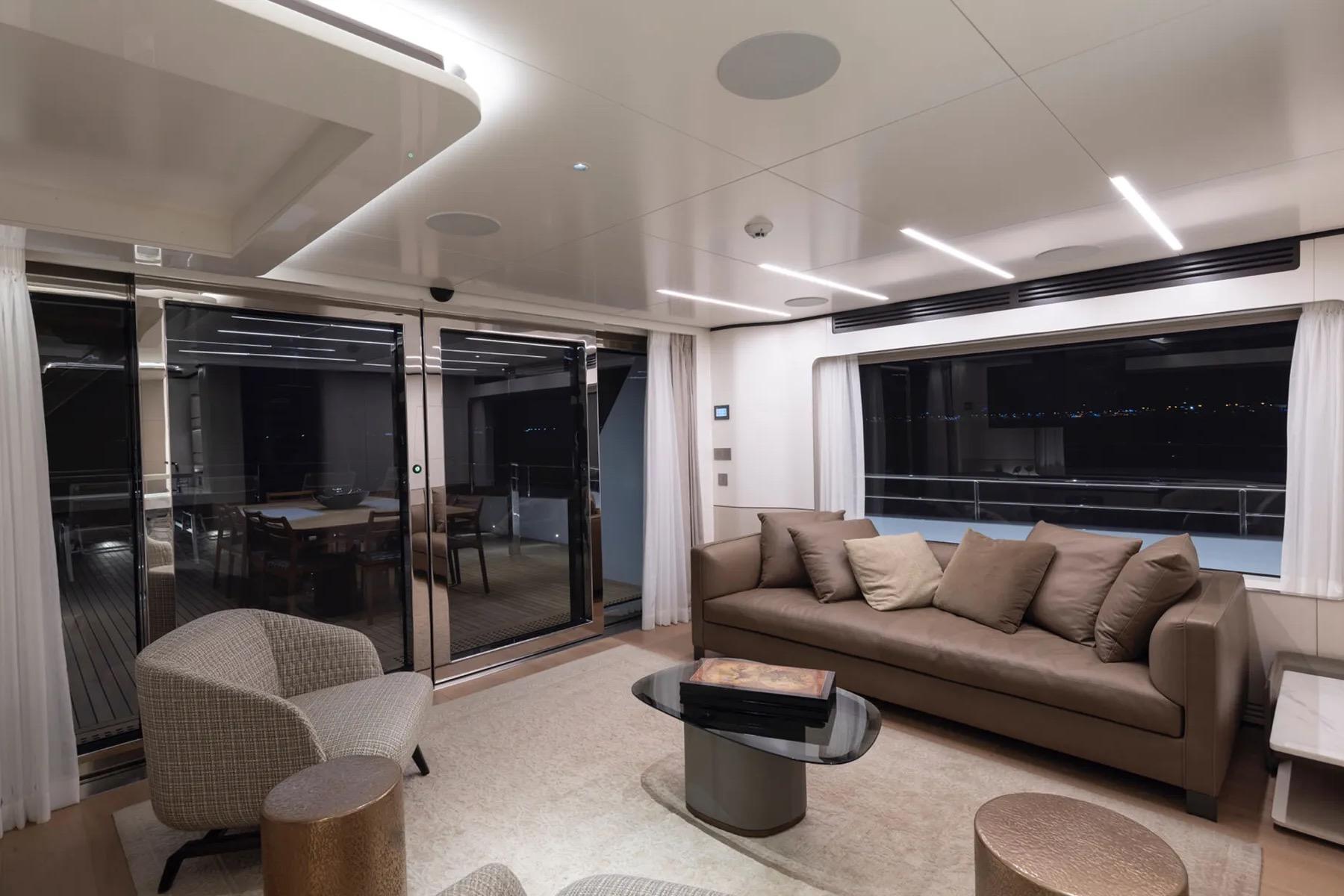 Elegant interior spaces are bathed in natural light through panoramic windows, finished in light oak, lacquered surfaces, and leather accents. Outdoors, she features a stunning aft-deck jacuzzi with infinity views, a spacious beach club with direct sea access, and a panoramic sundeck with bar and lounge area.