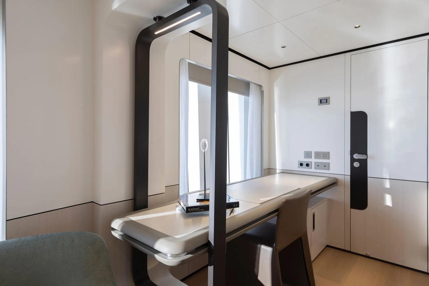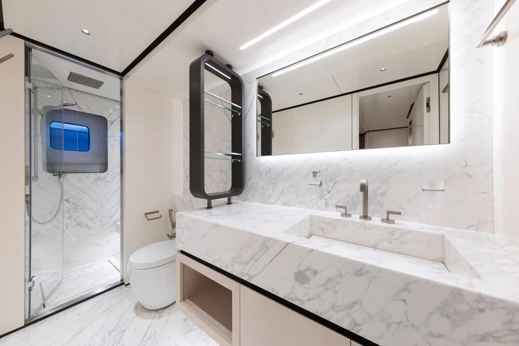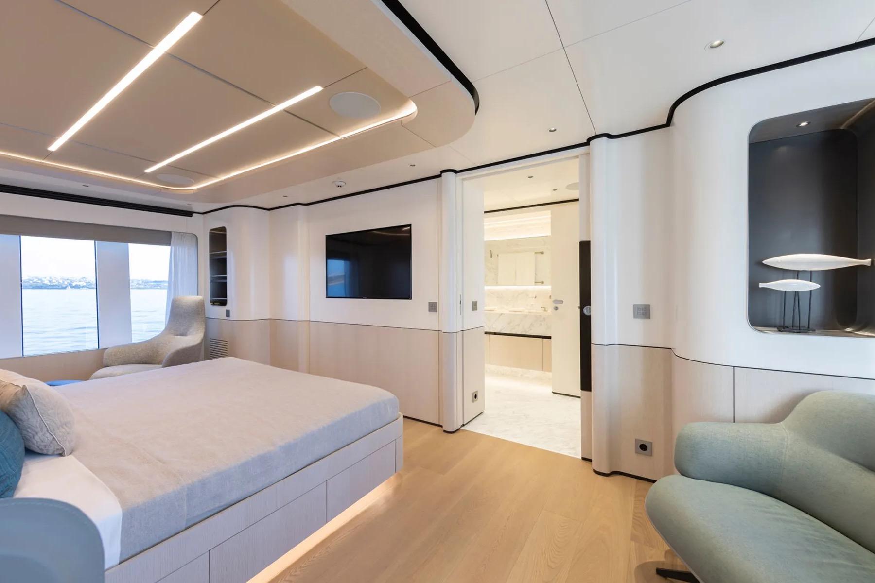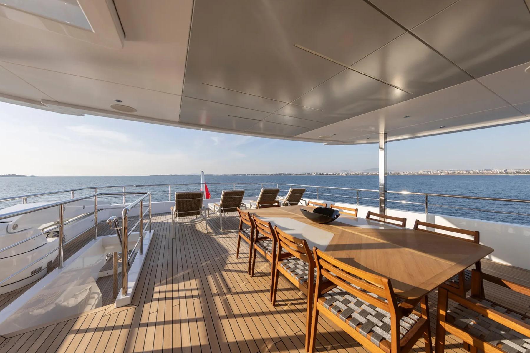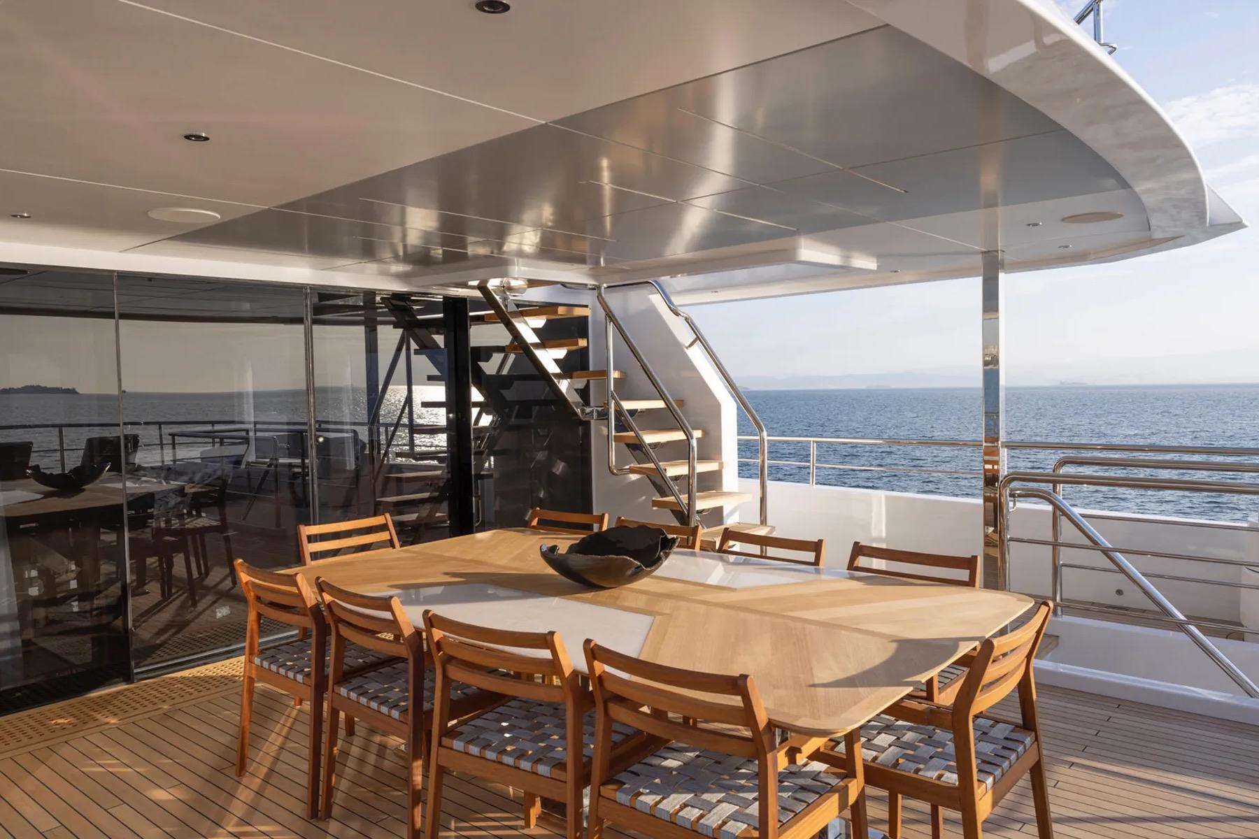 Elegant interior spaces are bathed in natural light through panoramic windows, finished in light oak, lacquered surfaces, and leather accents. Outdoors, she features a stunning aft-deck jacuzzi with infinity views, a spacious beach club with direct sea access, and a panoramic sundeck with bar and lounge area.